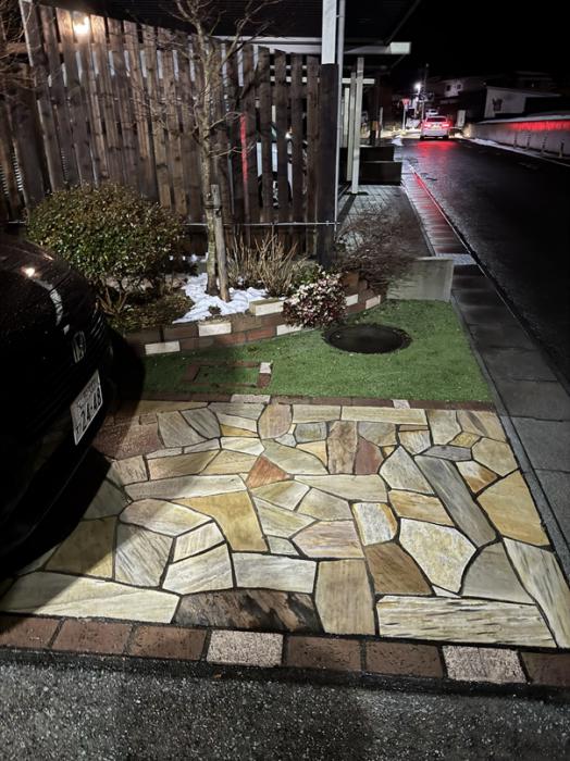 アプローチが乱石を綺麗に施工されていたので外観が建物の印象にも大きな影響を与えるのでこういうパターンも多く『よいにわ』として商品化していきたいと思いました。